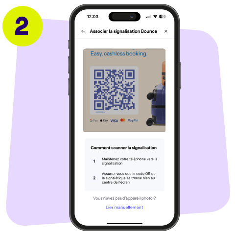 Sélectionnez Lier la signalétique Bounce et scannez le code QR de chaque signalétique avec votre appareil photo.